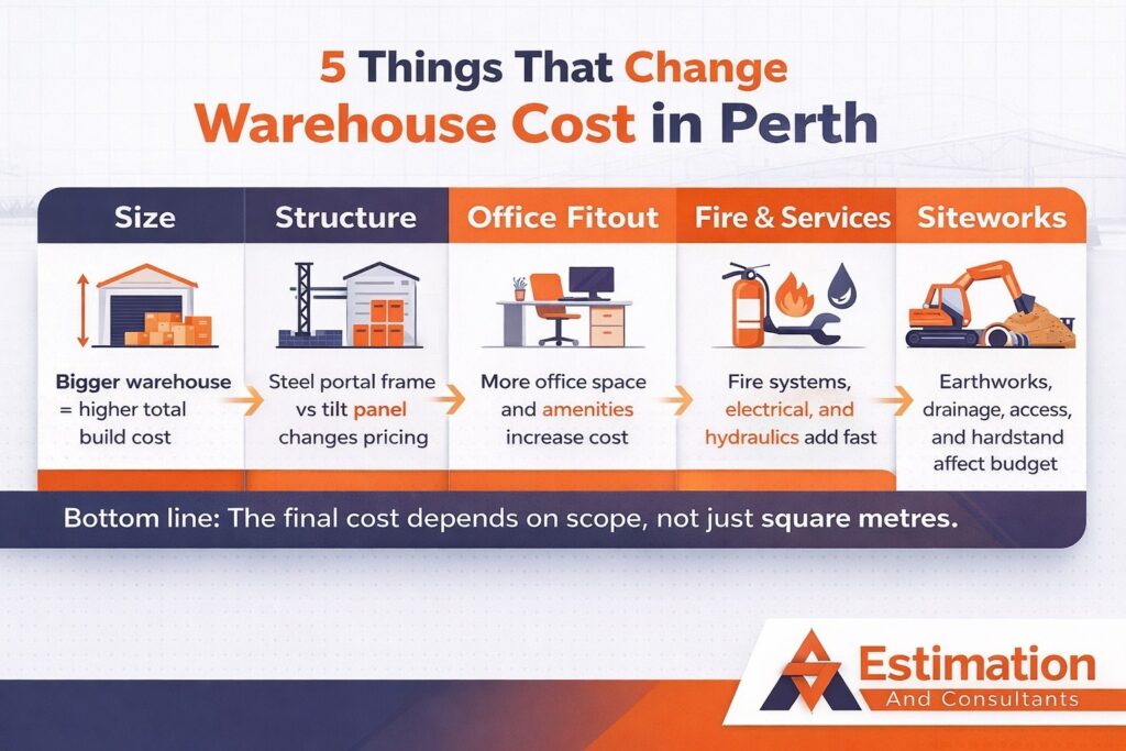 This matters because two warehouses with the same footprint can still have very different prices. A simple storage shed on an easy site will not cost the same as a taller warehouse with a larger office area, stronger slab design, and more complex fire services. That is why good cost planning for warehouses in Perth should focus on the biggest scope and design choices first, instead of relying only on broad Perth industrial construction rates.
