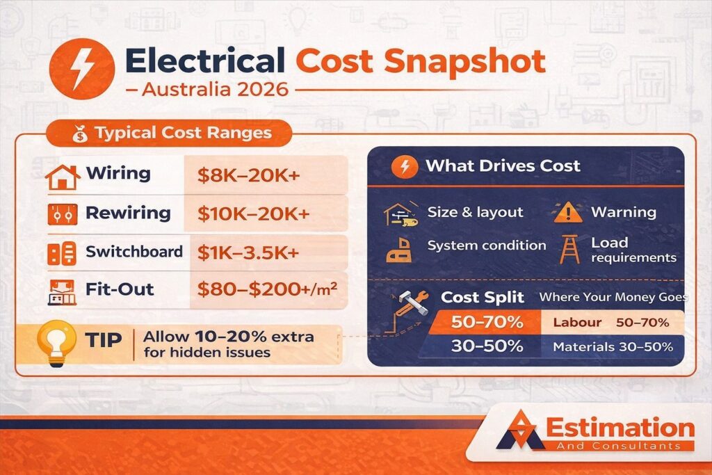 It covers the main job categories, including wiring and rewiring cost, switchboard upgrade pricing, residential vs commercial electrical cost, and electrical fit-out systems. The aim is simple: to make estimating electrical installation costs easier by explaining the real cost drivers for electrical installation and helping readers plan a more accurate electrical project cost breakdown.