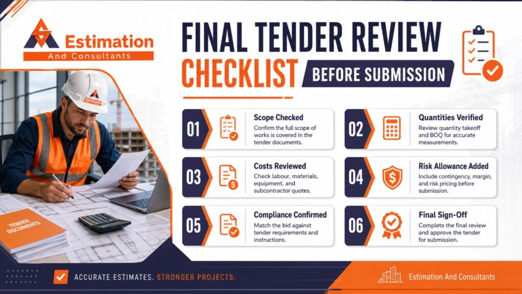 Before final submission, the estimate must be checked. An independent estimating review provides a fresh perspective, helping identify errors, missing items, or incorrect assumptions that may have been overlooked.